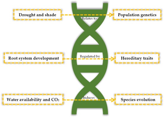 Although information regarding the genetic components of drought resistance in stone pine are scarce, studies on the hereditability of associated traits can be helpful in understanding the relationship between genetics and phenotypic plasticity. Hereditary traits are inherently related to the species genome. Once the capacity to survive drought periods is determined to be inherited through generations, breeding programs can focus on selecting the best individuals to perpetuate this genomic-based trait. Figure 5 represents the drought-response-related parameters evaluated in the literature.
