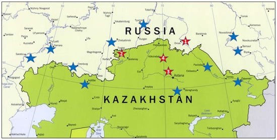 Location of KASIB trials used in the study: 1. Omsk State Agrarian University, Omsk (55.026333 N, 73.310254 E); 2. Karabalyk Agricultural Experimental Station, Karabalyk, Kostanay reg. (53.845009 N, 62.122684 E); 3. A.I. Barayev Research and Production Centre for Grain Farming, Shortandy, Akmola reg. (51.636491 N, 71.021044 E); 4. North Kazakhstan Agricultural Experimental Station, Shagalaly, North Kazakhstan reg. (54.163557 N, 69.521307 E). Blue stars indicate KASIB sites not included in the study.
