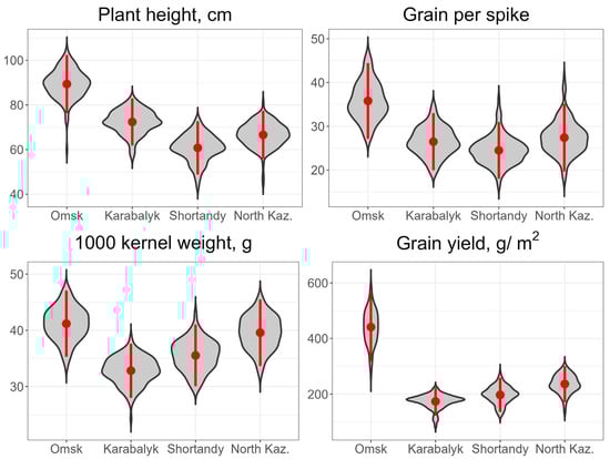 Pearson coefficients of correlations were calculated between grain yield and yield component traits across all 142 genotypes for each site and year separately (Table 2) using BLUEs. Plant height had a significant positive correlation in all nine trials. Taller germplasm tended to provide consistently higher yields, especially in Shagalaly and Shortandy. The number of grains per spike had a higher association with the grain yield compared to TKW, considering individual locations. The respective coefficients of correlation were significant in 10 trials out of 11, compared to 6 for TKW. The grain weight per spike, as an integral trait, had as high of an association with grain yield as did the number of grains per spike. The correlations computed for average values for each year across sites are much higher compared to individual trials, and all five traits demonstrate high and positive association with grain yield. This means that all agronomic traits included in this study are important in defining spring wheat productivity in the target environments.