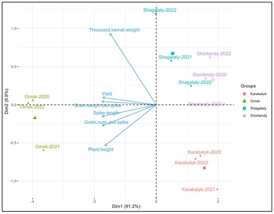 Biplot analysis of 11 trials using average yearly values of 6 traits demonstrated the differences between the years and sites (Figure 3). Three seasons in Omsk were quite similar and formed one compact group. Similarly, the three seasons at Karabalyk are also grouped. Shortandy and Shagalaly define two other groups in the same quadrat of the biplot, suggesting similar performances of the spring wheat panel at these two locations. The expression of all traits was the highest in Omsk, as indicated by the length and direction of the arrows. The combinations of agronomic traits in Karabalyk in 2021 and Shagalaly in 2022 were quite unique, setting these sites apart from each other and from other trials. Overall, the 12 sites-years combinations were sufficiently diverse to allow the comprehensive evaluation of KASIB core material for adaptation and agronomic traits.