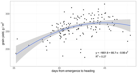 The rate of development or earliness measured by the number of days from emergence to heading is a key character for short-season wheat like in North Kazakhstan and Siberia. There is a clear positive association between the number of days to heading (within a range of 35–45 days) and grain yield (Figure 4). However, the later-heading and -maturing genotypes demonstrated lower yield, perhaps due to exposure to unfavorable conditions during maturity. The number of days from heading to maturity had a significant negative correlation with the number of days to heading (0.59) and an insignificant one with the grain yield.