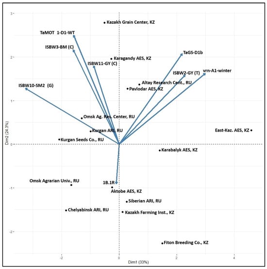 The important question was if the observed differences in the distribution of effective markers are related to agro-ecological conditions of the breeding programs or reflect the parentage, crossing and selection strategy employed by the breeders. At the time of the development of this germplasm, the breeders were not aware of the molecular markers and used conventional selection. The biplot location of the breeding programs according to the markers’ frequency (Figure 5) does not indicate the effect of agro-ecology as such. The breeding fields of the Omsk Agric. Research Center and University are only 5 km apart, but the markers’ frequency patterns are different. The same situation was found with Karabalyk AES and Fiton Breeding Company, and Kurgan ARI and Kurgan Seed Company. They are located close to each other, but the markers’ composition is different. There was a very close similarity between the breeding programs of Omsk Agrarian University and Kurgan Seeds, as well as Kazakh Grain Center and Karagandy ARI. East Kazakhstan AES stands apart from all other programs.