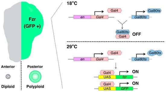 The artificially induced polyploid cell models in Drosophila are based on the Gal4-UAS binary expression system, which facilitates the expression of a specific cell-cycle regulatory gene such as fizzy-related (fzr, mammalian homolog of CDH1). In the Gal4-UAS system, Gal4 is a transcriptional activator that binds to the UAS enhancer sequences, thereby driving the expression of a gene of interest linked to UAS. Gal4 is typically fused to an enhancer sequence of a gene that is spatiotemporally active in specific organ regions, thereby controlling Gal4 expression in the specific region [75]. For instance, the engrailed-Gal4 (en-Gal4) is associated with the engrailed (en, a homeodomain selector gene) enhancer sequence, which is specifically expressed in the posterior compartment of the organ, enabling the induction of a UAS-gene expression in the posterior side of wing imaginal discs [76] (Figure 3).