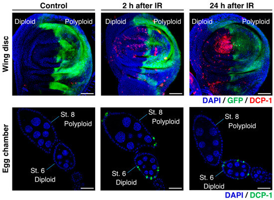 According to previous studies on Drosophila, it has been observed that the polyploid follicle cells in the egg chambers of the endocycling stage (oogenesis stage 7 to 10) do not show apoptosis after γ-irradiation, whereas a significant number of diploid follicle cells in the mitotic stages (stage 1 to 6) exhibit apoptosis [59,60,61]. This observation suggests that polyploid cells possess strong radiation resistance, which is similar to what has been reported in mammalian studies [65]. Indeed, the studies demonstrated that this radiation resistance of polyploid follicle cells is supported by the low level of p53 and silencing of pro-apoptotic genes [59,60,61,62]. The γ-ray-induced apoptosis in the Drosophila ovarian follicular epithelia was examined 24 h after irradiation [60]. To further validate these observations, we conducted additional experiments and confirmed that many diploid cells in the mitotic stages show apoptosis but polyploid cells in the endocycling stage do not at the 24 h after irradiation (Figure 4). At the same time, we found that polyploid follicle cells also undergo apoptosis shortly after irradiation (2 to 8 h after irradiation) (Figure 4). We confirmed similar apoptosis patterns in the endocycling polyploid cells induced in wing imaginal discs of en-Gal4>UAS-fzr. In the irradiated wing discs, apoptosis was observed in both anterior (diploid) and posterior (polyploid) compartments 2 to 8 h after irradiation, but apoptotic polyploid cells were not observed 24 h after irradiation (Figure 4). The similar pattern of apoptosis phenotypes in both experimental systems (endogenously developed polyploid cells in ovarian follicle cells and artificially induced polyploid cells in wing discs) indicate that polyploid cells possess not only the apoptosis-suppressive mechanisms but also a superior ability of DNA damage response or DNA repair.
