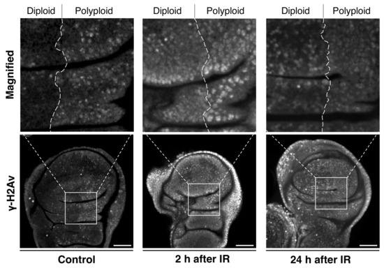 Considering that irradiation-induced apoptosis is caused by DNA damage, we examined the pattern of a DNA damage marker, γ-H2Av (H2Av is the Drosophila homolog of the mammalian histone H2A variants H2AZ/H2AX), in the polyploid wing disc model (en-Gal4>UAS-fzr) and found that the γ-H2Av pattern in polyploid cells is distinct from diploid cells. Under normal conditions without irradiation, nuclei of the polyploid cells displayed a punctate pattern of γ-H2Av signals (Figure 5). Under-replication of DNA where genomic copies are underrepresented in particular regions is commonly observed in endogenously developed polyploid cells of Drosophila larval fat body, midgut, salivary gland, and mouse trophoblast giant cells [128,129,130]. Therefore, the Fzr misexpression-mediated endocycling is likely to induce similar under-replication and cause the observed DNA damage. After a short period of irradiation (2 h), those nuclei of the polyploid cells showed an equivalent level of γ-H2Av signals compared to diploid cells, suggesting that polyploid cells do not avoid DNA damage to tolerate irradiation (Figure 5). In both diploid and polyploid cells, the γ-H2Av signal intensity was high in the entire region of the nucleus rather than being punctate patterns. Importantly, despite the increased γ-H2Av signals, the apoptotic rate was much lower in polyploid cells compared to diploid cells. After 24 h of irradiation, diploid cells continued to display strong γ-H2Av signals in the entire region of the nucleus, but the signals in polyploid nuclei reverted to a punctate pattern in which the signal was significantly lower than the nuclei of diploid cells. These observations indicate that polyploid cells may resist irradiation through a more effective or quick DNA damage response (DDR).