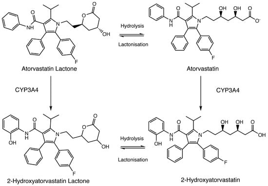 - Jacobsen, W.; Kuhn, B.; Soldner, A.; Kirchner, G.; Sewing, K.F.; Kollman, P.A.; Benet, L.Z.; Christians, U. Lactonization is the critical first step in the disposition of the 3-hydroxy-3-methylglutaryl-CoA reductase inhibitor atorvastatin. Drug Metab. Dispos. 2000, 28, 1369–1378. [Google Scholar] [PubMed]