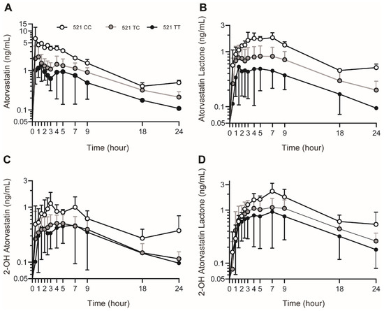 (A) Mean ± SD plasma analyte concentrations (ng/mL) of atorvastatin, (B) atorvastatin lactone, (C) 2-hydroxyatorvastatin, and (D) 2-hydroxyatorvastatin lactone. Black, gray and open white circles denote participants with the c.521T/T (n = 13), c.521T/C (n = 13) and c.521C/C (n = 2) genotypes, respectively.
