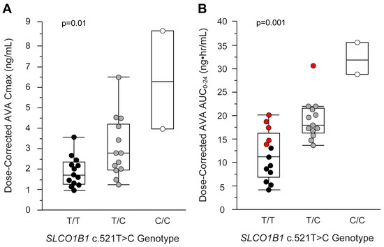 The maximum mean AVA concentrations (Cmax) were 3.6-fold higher in the c.521C/C (n = 2) group and 2.8-fold higher in the c.521T/C (n = 13) group relative to the c.521T/T (n = 13) group (Figure 3A, Table 2). The mean AVA AUC0–24 was 2.8-fold higher in the c.521C/C group and 1.7-fold higher in the c.521T/C group relative to the participants with the reference genotype (Figure 3B, Table 2).