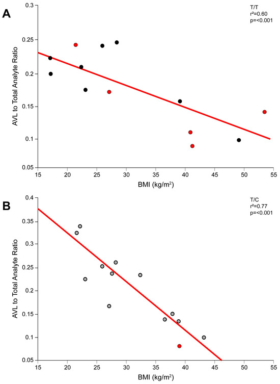 Correlation between AVL + 2-OH AVL-to-total-analyte ratio and BMI in the (A) c.521T/T and (B) SLCO1B1 c.521T/C genotype groups. Black and gray circles denote participants with the c.521T/T (n = 13) and c.521T/C (n = 13) genotypes, respectively. Red circles denote “high-exposure-subgroup” participants (c.521T/T, n = 5; c.521T/C, n = 1).