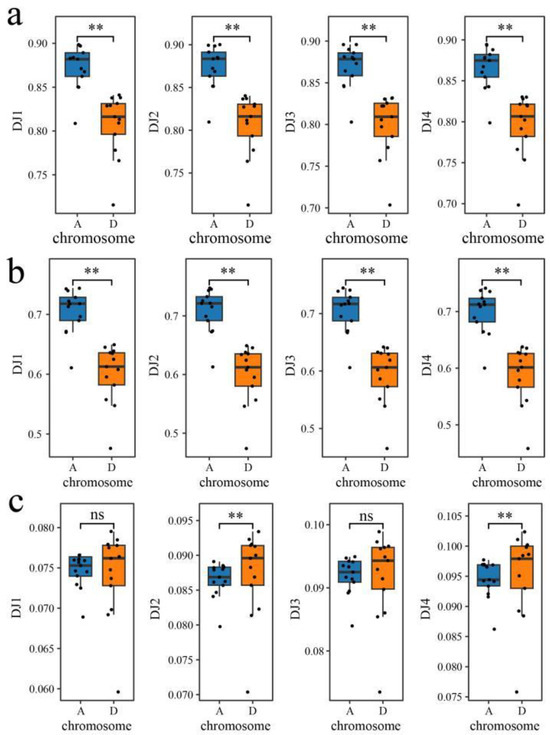 (a) CG methylation levels of each subgenome at 0 h and 40 h under the high-temperature stress treatment in Xinluzao 36 and Che 61–72; (b) CHG methylation levels in each subgenome at 0 h and 40 h under the high-temperature stress treatment in Xinluzao 36 and Che 61–72; and (c) CHH methylation levels in each subgenome at 0 h and 40 h under the high-temperature stress treatment in Xinluzao 36 and Che 61–72. (error bars represent the mean ± SE of three replicates, ** p < 0.01. ns means no statistical significance).