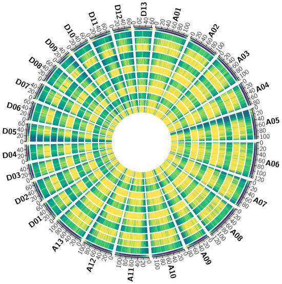 The changes in the genome methylation level in the cotton leaves after the high-temperature stress treatment were further analyzed, the methylation level of each window at a size of 100 K was calculated, and the C-base methylation level of different samples was analyzed at the chromosome level (Figure 3). The CG methylation density of each chromosome was lower than that of CHG and CHH at the four treatment periods for the two materials, and the methylation density of the middle region of each chromosome was greater than that of both ends, which was opposite to the distribution density of genes. The methylation density of CHG and CHH in the A subgenome was greater than that in the D subgenome. On each chromosome of the D subgenome, the methylation density of CHH was greater than that of CG and CHG.