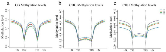 (a) CG methylation levels in genetically different regions of the genome (upstream, gene body, and downstream); (b) CHG methylation levels in genetically different regions of the genome (upstream, gene body, and downstream); and (c) CHH methylation levels in genetically different regions of the genome (upstream, gene body, and downstream).