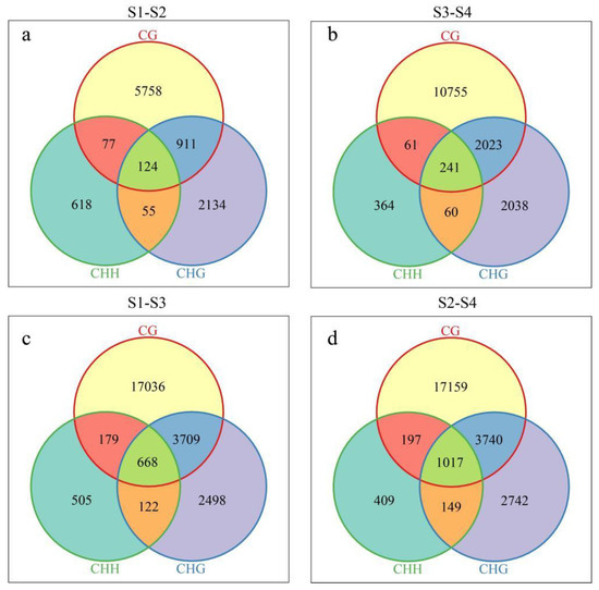 (a) Venn diagram of the differential methylation regions (DMRs) at 0 h and 12 h under high-temperature stress treatment; different colors represent different methylation types, and the numbers represent the number of DMRs. (b) Venn diagram of the differential methylation regions (DMRs) at 0 h and 12 h under high-temperature stress treatment; the different colors represent different methylation types and the numbers represent the number of DMRs. (c) Venn diagram of the differential methylation regions (DMRs) at 0 h under high-temperature stress treatment; the different colors represent different methylation types and the numbers represent the number of DMRs. (d) Venn diagram of the differential methylation regions (DMRs) at 6 h and 72 h under high-temperature stress treatment; the different colors represent different methylation types and the numbers represent the number of DMRs.