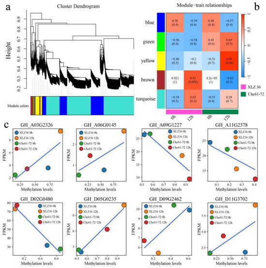 Based on the expression levels of 5130 common DEGs and differentially methylated genes, β = 4 was selected to construct the network, the dynamic shear tree method was used to merge the similarly expressed modules, and a total of five coexpression modules (Figure 7a) were obtained. The yellow module was significantly correlated with the high-temperature stress treatment of Che 61–72 after 12 h, and the brown module was significantly correlated with the high-temperature stress treatment of Xinlu Zao 36 after 12 h (Figure 7b). Each module identified the four genes with the highest connectivity as hub genes and ultimately obtained eight hub genes (Figure S1). The relationships between the expression levels of these eight candidate genes and methylated water were further calculated, and the expression levels of five genes (GH_A03G2326, GH_A06G0145, GH_D05G0235, GH_D09G2462, and GH_D11G3702) were positively correlated with the methylation level, whereas those of three genes (GH_A09G1227, GH_A11G2378, and GH_D02G0480) were inversely correlated with the methylation level. Methylation of GH_A03G2326 occurs in the gene body region, and methylation of GH_A06G0145, GH_D05G0235, GH_D09G2462, and GH_D11G3702 occurs in the 2 kb region downstream of the gene body. GH_A09G1227, which involves the methylation of GH_A11G2378 and GH_D02G0480, is located in the 2 kb region upstream of the gene body. These findings indicate that G. hirsutum DNA methylation can promote or inhibit gene expression at the transcriptional level under high-temperature stress conditions and that the methylation that promotes gene expression is located mainly in the downstream or gene region, whereas the methylation that inhibits gene expression is located mainly in the upstream region of the gene.