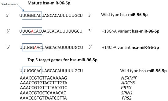 Mature hsa-miR-96-5p and miR-96 (+13G>A) and (+14C>A) mutations are shown to be aligned. The reference base “G” is written in black and the variant base “A” is written in red. The top 5 genes that are regulated by hsa-miR-96-5p genes are also aligned.