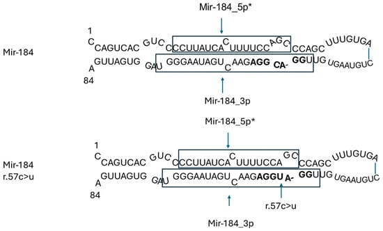 Two additional mutations in MIR184 (n.3A>G and n.8C>A) have been identified in families affected by isolated keratoconus [,]. Both mutations, miR-184 (n.3A>G) and miR-184 (n.8C>A), disrupt the stem-loop secondary structure of miR-184. The mutation at position 3 alters an adenine residue, which normally pairs with uracil in the wild-type miR-184 stem-loop, to a guanine residue, reducing the base pair probability. Similarly, the mutation at position 8 replaces a cytosine, which typically pairs with guanine in the wild-type structure, with an adenine residue, enlarging the bulge of unpaired residues from six to eight. The structural integrity of miRNA precursors is critical for recognition and cleavage by DROSHA and DICER, proteins essential for miRNA processing. The structural alterations induced by these mutations are likely to interfere with miRNA maturation, potentially affecting miRNA expression and modifying downstream biological processes and pathways [].