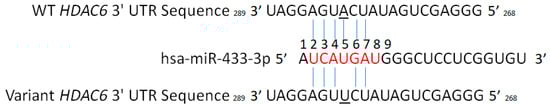 The genes implicated in chondrodysplasias are involved in encoding extracellular matrix proteins, signaling molecules, transcription factors, or components of metabolic pathways. A family with X-linked dominant chondrodysplasia was found to have a novel variant, c.*281A>T in the 3′ untranslated region (UTR) of the HDAC6 gene that segregates well with the disease in the family. This variant lies within the binding site, or seed sequence, of miR-433, responsible for the post-transcriptional regulation of HDAC6 expression. The mutation disrupts the miR-433-mediated post-transcriptional regulation of HDAC6, resulting in elevated levels of HDAC6 expression in affected individuals. This dysregulation of HDAC6 has profound effects on cartilage and bone development, as HDAC6 influences processes such as cell differentiation, cytoskeletal organization, and protein turnover. The c.*281A>T variant lies within a sequence matching the seed of miR-433. The predicted miR-433 site in the HDAC6 3′UTR contains the miRNA seed sequence (miRNA nucleotides 2–7; 5′UCAUGAUG3′). A perfect and contiguous match to miRNA nucleotides 2–7 is crucial for the biological and functional properties of miRNAs, and any mismatch in that sequence greatly affects gene expression regulation. The c.*281A>T variant changes the predicted miRNA site from 5′AUCAUGA3′ to 5′AUCUUGA3′, disrupting miR-433 binding and leading to increased HDAC6 expression [,] (Figure 4).