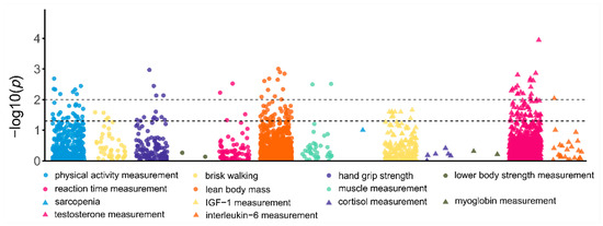 In the GWAS Catalog database, we initially identified 7773 variants significantly associated (p ≤ 5 × 10−8) with various traits: 2777 for testosterone measurement, 1608 for lean body mass, 514 for IGF-1 measurement, 230 for hand grip strength, 167 for reaction time measurement, 75 for brisk walking, 69 for interleukin-6 measurement, 62 for muscle measurement, 20 for thigh muscle volume, 14 for cortisol measurement, 3 for myoglobin measurement, 3 for lower body strength measurement, and 1 for sarcopenia (Supplementary Table S1).