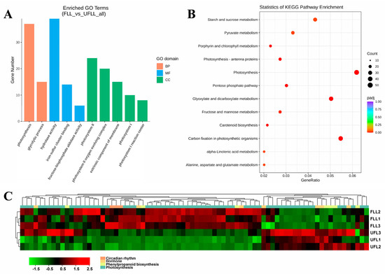 Subsequently, we examined the function of DEGs from FLL vs. UFLL and found that these DEGs mainly operated in photosystem II, photosystem II oxygen-evolving complex, the extrinsic component of membrane, photosystem I, photosystem I reaction center, and chloroplast (Figure 2A; Table S3), with bioactivities related to iron-sulfur cluster binding, hydrolase activity, fructose-bisphosphate aldolase activity, catalytic activity, metal ion binding, oxidoreductase activity, and coenzyme binding (Figure 2A; Table S2). The results relevant to the biological process indicated that these DEGs from FLL vs. UFLL are primarily involved in Photosynthesis, glycolytic process, cellular protein modification process, trehalose biosynthetic process, and metal ion transport (Figure 2A; Table S2). The Photosynthesis level was closely tied to plant flowering phenotypes, offering energy to maintain the plant flowering process. Further KEGG pathway investigation indicated that transcription changes related to Photosynthesis, Carbon fixation in photosynthetic organisms, Glyoxylate and dicarboxylate metabolism, Phenylpropanoid biosynthesis, Pentose phosphate pathway, Porphyrin and chlorophyll metabolism, Carotenoid biosynthesis, Fructose and mannose metabolism, α-Linolenic acid metabolism, Pyruvate metabolism, and Alanine, aspartate, and glutamate metabolism were the main features of FLL vs. UFLL (Figure 2B), suggesting their roles in the flowering process of F. sinkiangensis. Commonly, secondary metabolisms represented by Phenylpropanoid biosynthesis have also been involved in flowering mechanisms of plants. We analyzed the expression level of genes associated with these three terms in leaves of flowering and unflowering F. sinkiangensis. As presented in Figure 2C, most of the genes relevant to Photosynthesis and Phenylpropanoid were highly expressed in the leaves of flowering F. sinkiangensis compared to the leaves of unflowering F. sinkiangensis (Figure 2C). These results suggested that transcription upregulation is associated with primary metabolisms in roots, together with Photosynthesis and Phenylpropanoid biosynthesis in leaves, which is involved in the flowering process of F. sinkiangensis.