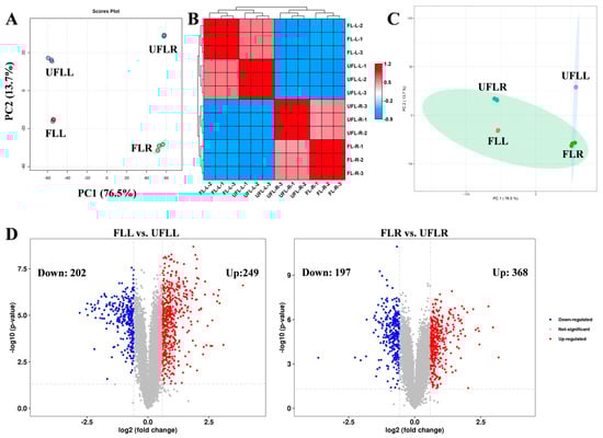 Transcriptional landscape in leaves and roots of flowering and unflowering F. sinkiangensis. (A): PCA score plots of samples depicting pronounced differentiation across FLL and UFLL at the transcriptional level. The ellipse indicates the 95% confidence interval. (B): Unsupervised correlation assessment of all transcriptome profiles in flowering and unflowering F. sinkiangensis according to the Pearson algorithm. High and low correlation relationships were presented in red and green, respectively. (C): Volcano plot indicating the differential genes (DEGs) with Log2(Foldchanges) ≥ 1.0 and p ≤ 0.05 in FLL vs. UFLL and FLR vs. UFLR pairwise comparisons. The upregulated genes are presented in red, and the gray points represented genes with no significance in each pairwise comparison, while downregulated representatives are illustrated in green.