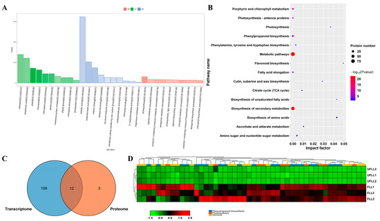 Proteome alterations in Photosynthesis and Phenylpropanoid biosynthesis in leaves involved in the flowering process of F. sinkiangensis. (A): Gene ontology (GO) enrichment analysis on DEPs from FLL vs. UFLL pairwise comparison. The terms cellular component, molecular function, and biological progress are shown in green, blue, and orange, respectively. The column represented the number of DEPs in each GO term. (B): Scatter plot of the most enriched KEGG pathways of all DEPs from FLL vs. UFLL pairwise comparison. The size and color of each plot denote the number of proteins and the significance of each associated pathway. The x−axis represents the rich factor of each pathway. The impact factor was generated by adding the importance measures of matched proteins of all proteins in the pathway. (C): Venn diagram of transcriptome and proteome. (D): Heatmaps of the relative expression abundances of DEPs relevant to Photosynthesis, Phenylpropanoid, and Hormone synthesis in the leaves of flowering and unflowering F. sinkiangensis. The scale bar indicated the average level of DEPs across each group. The high and low levels were presented in red and green, respectively.
