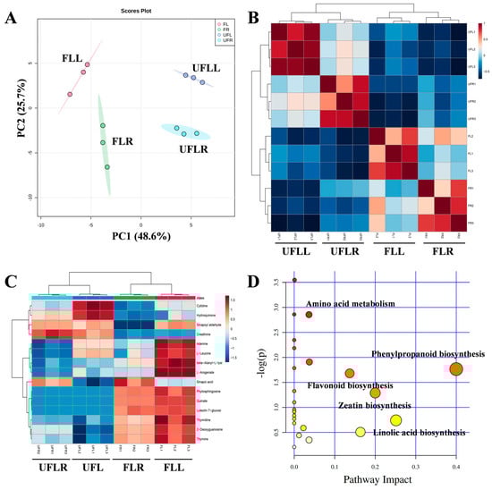 Metabolic landscape in roots and leaves of flowering and unflowering F. sinkiangensis. (A): Analysis using PCA scores plot of the samples indicates a distinct separation between FLL, FLR, UFLR, and UFLL at the metabolome level, with the ellipse representing the 95% confidence interval. (B): Unsupervised hierarchical clustering analysis reveals the differentiation in metabolic patterns among the FLL, FLR, UFLR, and UFLL groups. (C): A heatmap demonstrates the varying levels of Phenylpropanoids and flavonoids in these groups. The up- and downregulated metabolites were presented with red and blue, respectively. The normalized peak area of metabolites from each sample was utilized to denote the abundances. (D): KEGG pathway enrichment analysis on DEMs among FLL, FLR, UFLR, and UFLL groups. Different color levels indicated varying levels of significance in metabolic pathways, ranging from low (green) to high (red). The scatter size denoted the metabolite number from each pathway.