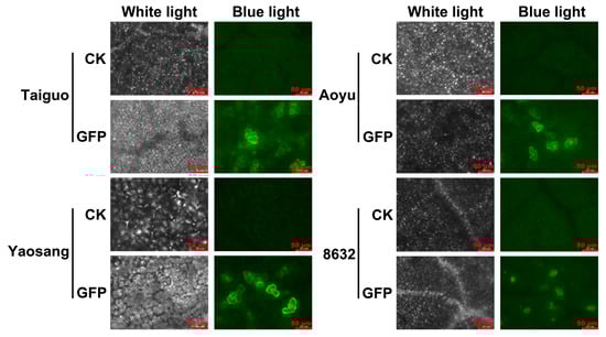 One part of the infiltrated leaves from ‘Taiguo’, ‘Yaosang’, ‘Aoyu’, and ‘8632’ was used for GFP fluorescence detection, and the other part was used for GFP protein determination.