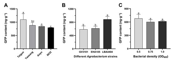 Additionally, the impact of different Agrobacterium strains and bacterial densities on the transformation efficiency was assessed in vitro in mulberry leaves of ‘Taiguo’ (Figure 2B,C). Although Agrobacterium strains GV3101, EHA105, and LBA4404 are commonly used [40,48], differential transformation rates were observed between different Agrobacterium strains in this study, as previously reported. The Agrobacterium strain LBA4404 exhibited significantly higher total GFP content in mulberry leaves (p < 0.05), compared to strains EHA105 and GV3101 (Figure 2B). Notably, higher transformation efficiency was observed at OD600 0.5, compared to OD600 0.75 and OD600 1.0 (Figure 2C), highlighting that high-density Agrobacterium can potentially disrupt the physiological functions of plant cells or even lead to cell death. Similar findings have been reported, emphasizing that the infectivity of A. tumefaciens strain LBA4404 was stronger than that of GV2260 and A281 in M. indica cv. K2 [30], and the level of OD600 0.5 was chosen for consistent transient expression of the GUS gene in mulberry seedlings (M. alba L.) [40]. Many different strains of Agrobacterium are available and may show additional potential for agroinfiltration or transformation of various plant species [63]. These findings underscore the necessity of optimizing mulberry genotypes, A. tumefaciens strain, and bacterial density for an efficient transient transformation system.