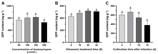 Furthermore, an in-depth exploration into the dynamic changes of the GFP gene’s transient expression levels was conducted, focusing on the variables of acetosyringone concentration, sonication duration, and days after infection (Figure 3). The findings unveiled that the optimal transformation efficiency was achieved with an acetosyringone concentration of 150 μM in the infiltration medium (Figure 3A). Nevertheless, no statistically significant differences in the GFP contents were observed among different acetosyringone concentrations (Figure 3A). Additionally, the outcomes of GFP content detection indicated that various sonication treatments could significantly enhance transient transformation efficiency compared to the control (p < 0.05); however, no statistically significant differences were observed between ultrasonic treatments (Figure 3B). Moreover, a comprehensive investigation into transient expression levels of the GFP gene was conducted at 4, 7, 10, and 15 d after infection (Figure 3C). Notably, the peak GFP content was observed on the 7th d after infiltration, followed by a gradual decline until the 15th d (Figure 3C). No statistically significant differences were observed at 4, 7, and 10 d after infiltration; only a significant decrease was observed at 15 d after infiltration (Figure 3C).