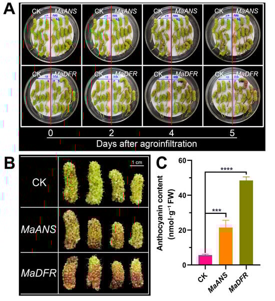 Moreover, to assess the robustness and dependability of the established transient transformation system utilizing Agrobacterium-mediated sonication followed by vacuum infiltration, MaANS and MaDFR were transiently overexpressed in the mulberry fruits of ‘Taiguo’ at 10 DAF. The results exhibited a substantial increase in fruit coloring at 5 d (Figure 4A) and 7 d (Figure 4B) post-infiltration due to the overexpression of MaANS and MaDFR, respectively. Furthermore, the anthocyanin content assay disclosed a remarkably significant surge in anthocyanin levels in fruits infiltrated with pMV2-ANS and pMV2-DFR at 7 d post-agroinfiltration, respectively (Figure 4C). Comparatively, the overexpression of MaDFR led to a more pronounced effect on promoting anthocyanin accumulation in the fruits compared to MaANS (Figure 4B,C). These findings affirm the involvement of MaANS and MaDFR in the biosynthesis process and enrichment of anthocyanins in mulberry fruits.