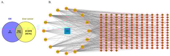 (A) The Venn diagram of overlapping target genes of CKI and liver cancer. (B) The ingredient–target network of CKI, where the blue rectangle is CKI, the circular nodes represent the active components of CKI, and the prism nodes denote the potential targets of CKI.