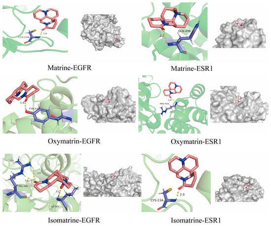 EGFR, ESR1, and the top three active ingredients from the component–target network and PPI network—matrine, oxymatrine, and isomatrine—each ranked by the median value, were selected for molecular docking using Auto-dock software (AutoDockTools-1.5.7).