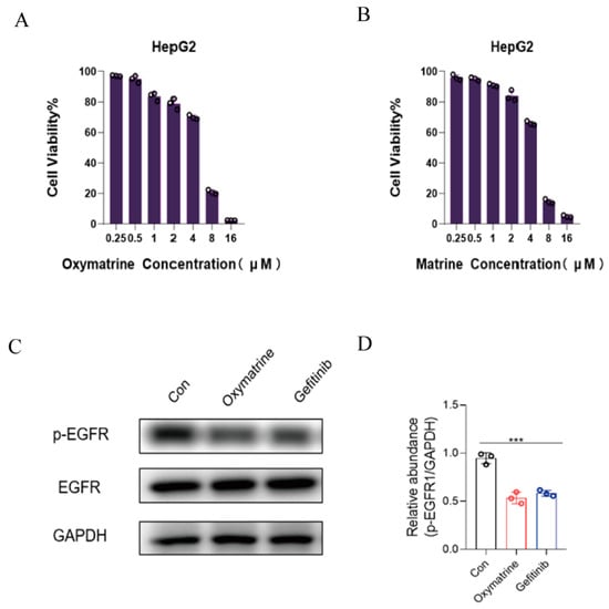 Based on the molecular docking results, oxymatrine demonstrated the lowest binding energy with the EGFR protein target. Consequently, we employed a Western blot analysis to assess oxymatrine’s impact on the expression of phosphorylated EGFR (p-EGFR). Western blot results showed that oxymatrine could reduce the expression of p-EGFR in HepG2 cells and achieve a therapeutic effect on liver cancer (Figure 5C,D).