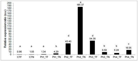 Relative gene expression in arbitrary units (a.u.) of the target gene, HSP17.9A, determined for the in vitro TF and TN plants at the end of each experimental phase (Ph1 to Ph4), relative to the control plants. Different lowercase letters among bars represent statistically significant differences (p ˂ 0.05). Notes: CTF and CTN—control plants of TF and TN varieties, respectively; Ph1—32 °C for 3 h (heat acclimation); Ph2—42 °C for 1 h (severe HS); Ph3—32 °C for 3 h (first recovery period); and Ph4—24 °C during 24 h (second recovery period).