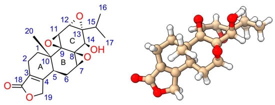 Structure of triptolide. The oxygen atoms and hydroxide group are highlighted in red.