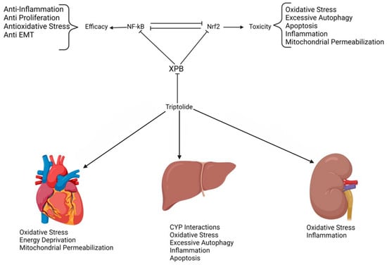 The clinical application of triptolide is significantly limited due to its broad-spectrum toxicity, particularly affecting the liver, heart, and kidneys (Figure 3). A recurring theme across multiple studies is the pivotal role of Nrf2 inhibition in mediating this toxicity. Nrf2, a crucial transcription factor for supporting redox homeostasis, is suppressed by triptolide, leading to increased oxidative stress and subsequent organ damage. This inhibition impaired the activation of antioxidant response elements, reducing cellular ability to counteract oxidative insults. The hepatotoxicity, nephrotoxicity, and cardiotoxicity induced by triptolide are all worsened by this suppression of the Nrf2 pathway.
