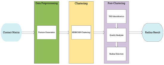coiTAD’s pipeline. This figure details coiTAD’s entire pipeline in a graphic table. It details the process of creating features, employing HDBSCAN, identifying TADs from given clusters, evaluating the quality of those TADs, and finally receiving the best radius result.