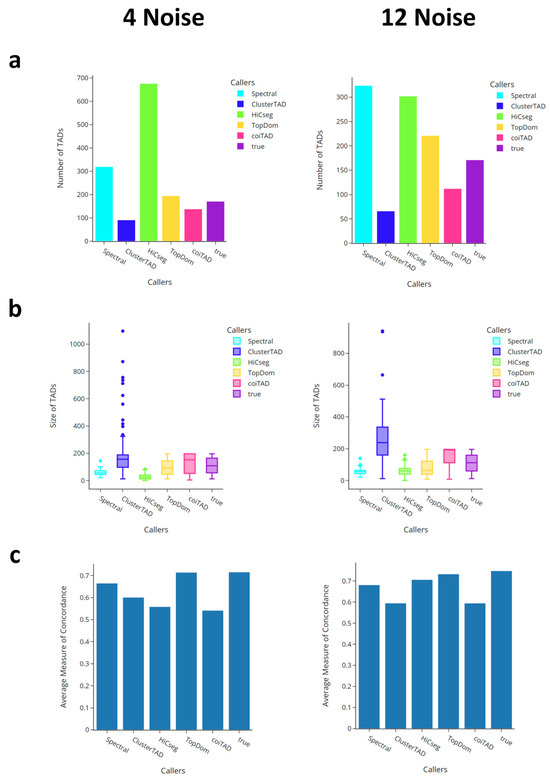 Comparison of TAD callers on simulated 4-noise and 12-noise datasets. TAD callers were analyzed based on numbers of TADs identified, size distribution of called TADs, and the average measure of concordance across all callers. (a) Number of TADs identified; (b) size distribution of TADs; (c) average measure of concordance across callers.