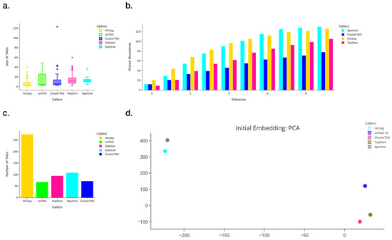 Comparison of callers on hESC chromosome 19. Comparison of multiple TAD callers on raw hESC chr19 Hi-C dataset from Dixon et al. (a) Comparison of TAD size across callers; (b) one-versus-all comparison of shared boundaries with coiTAD; (c) numbers of identified TADs across callers; (d) PCA Comparison Plot on TAD callers’ results.
