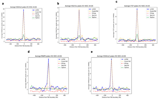 Topologically associated domains are characterized by high levels of internal interactions and are delineated by boundaries that act as insulators, restricting interactions between adjacent TADs. These boundaries are often enriched with binding sites for CTCF and key histone modification marks associated with regulatory functions [30,31,32,33,34,35,36,37]. To validate the TAD boundaries identified by coiTAD, we performed enrichment analysis for these markings on hESC chromosome 19 data (Figure 9). We compared coiTAD’s validation results with the same callers we compared it against on chromosome 1 and 19 data.