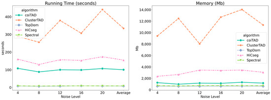 To evaluate coiTAD performance in comparison to other TAD callers, we recorded running time and peak memory and observed that coiTAD showed comparable performance with other state-of-the-art methods (Figure 11). We recorded running time and peak memory during simulated data analysis at 40 Kb resolution with five TAD callers including coiTAD. We observed that coiTAD’s average running time was 100 s and its peak memory consumption was 1500 Mb, which was considerable and ranked in the middle position compared with the other four TAD callers.
