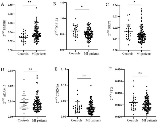 3.2. Relative mRNA Expression of HMGB1, TGF-β1, BIRC3, ADAM17, CDKN1A, and FTO in PBMCs from Controls and Patients with MI Six Months after MI