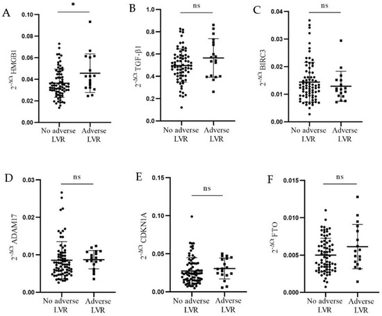 | LV Parameter Change (∆) | 2−ΔCt HMGB1 | 2−ΔCt TGFβ | 2−ΔCt BIRC3 | 2−ΔCt ADAM17 | 2−ΔCt CDKN1A | 2−ΔCt FTO | ||||||