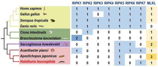 Figure 1. Numbers of the genes of the RIPK gene family and the MLKL gene among different species. In the evolutionary tree of 10 representative Deuterostomia species, the yellow branch represents Vertebrata, the green branch represents Urochordata and Cephalochordata, the purple branch represents Hemichordata and the red branch represents Echinodermata.