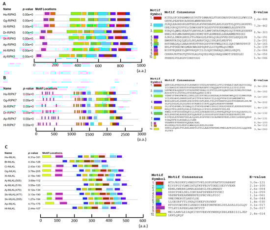 Figure 3. The protein motif patterns of RIPK5 (A), RIPK7 (B), and MLKL (C).