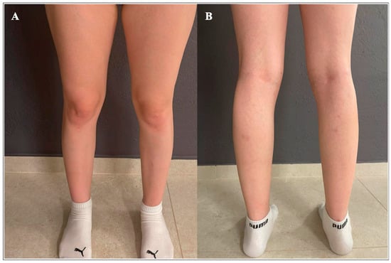 Lower extremities at the age of 18 years. (A) From the front: clinical findings were unremarkable, except for potential mild hypotrophy of the lower leg muscles. (B) From the back: clinical findings were unremarkable, with no calf hypertrophy.