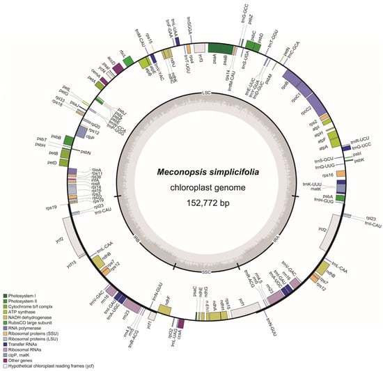 The cp genome serves as a valuable resource for interspecific differentiation and various biotechnological applications [41]. In this study, we sequenced and assembled the complete cp genome of M. simplicifolia. The cp genome of M. simplicifolia has a typical quadripartite circular structure with a GC content of 38.74%, similar to the chloroplast genome characteristics of most Meconopsis species [1]. The size of the M. simplicifolia cp genome was 152,772 bp, consistent with other Meconopsis species ranging between 151 and 154 kb [30,32,33]. All these complete cp genomes displayed a GC content of 38%, which is in line with the low GC content observed in the cp genomes of other angiosperms [13].