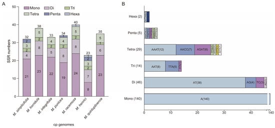 An analysis of simple sequence repeats (SSRs) in the cp genomes of the seven Meconopsis species. (A) Number of different types of SSRs; (B) frequency of identified SSR motifs in different repeat classes.