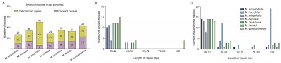 An analysis of the repeated sequences in the cp genomes of the seven Meconopsis species. (A) Frequency of palindromic and forward repeats; (B) frequency of forward repeats by length; (C) frequency of palindromic repeats by length.