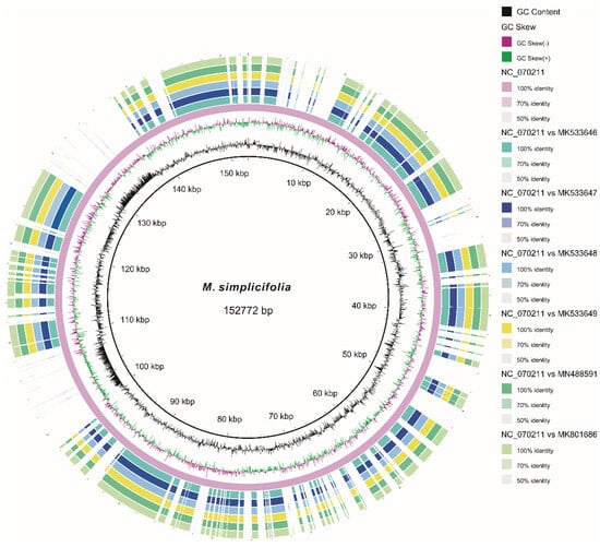 BRIG ring comparison of the cp genomes of the seven Meconopsis species. The innermost rings represent the GC content (black) and GC skew (purple/green). The seven outer circles depict the similarity results compared to the reference genome (M. simplicifolia. NC_070211).